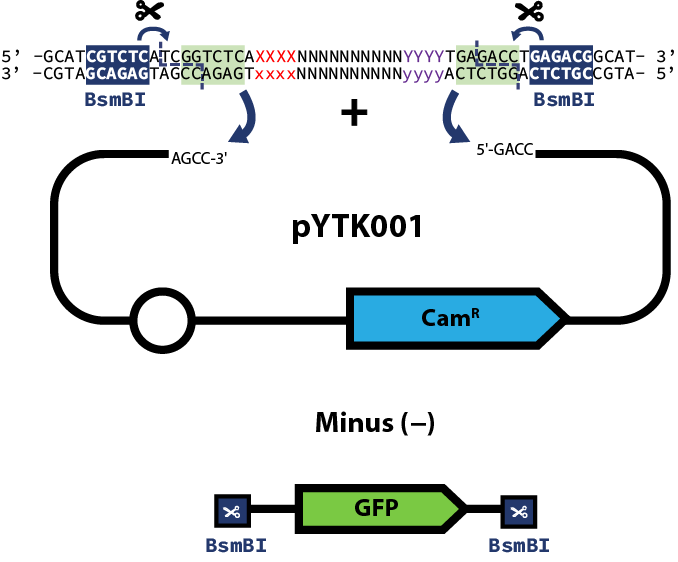 here) you can proceed to the assembly step of the part plasmid itself. The example reaction below shows pYTK001 used as the entry vector for the reaction; however, this can be substituted for any other entry vector with requisite BsmBI cut sites. Once built, part plasmids can be assembled into transcriptional units.